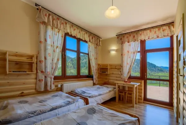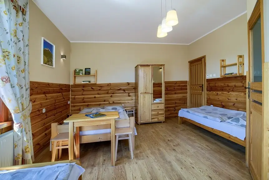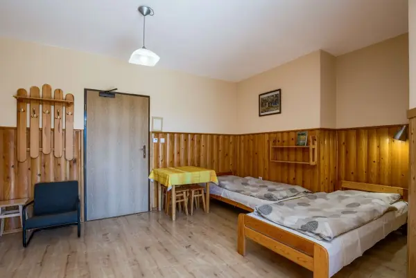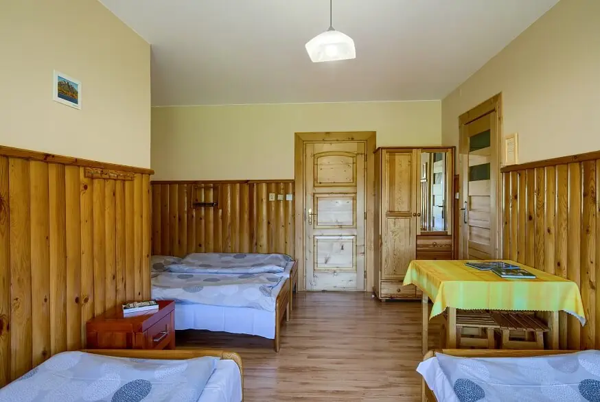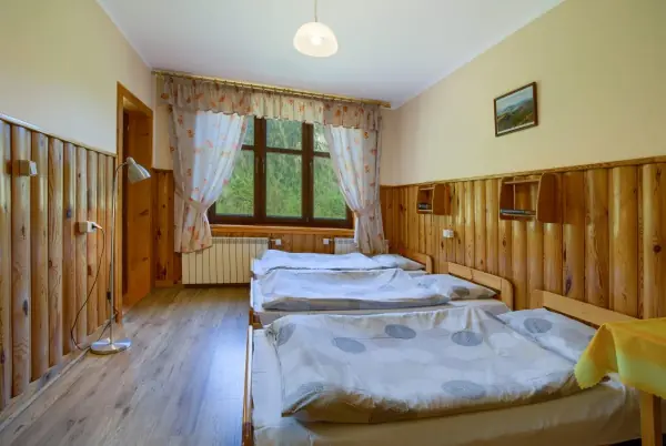 Posiadamy 50 miejsc noclegowych o bardzo wysokim standardzie. Oferujemy pokoje do wynajęcia 2-, 3-, 4- i 5-osobowe. Wszystkie posiadają łazienki, a większość z nich wyposażona jest również w balkony lub w duży taras. Dzięki temu mogą Państwo zażywać kąpieli słonecznych i rozkoszować się pięknym krajobrazem. Z okien schroniska rozciągają się zapierające dech w piersiach widoki na szczyt Trzech Koron, Czerwony Klasztor oraz przełom Dunajca.